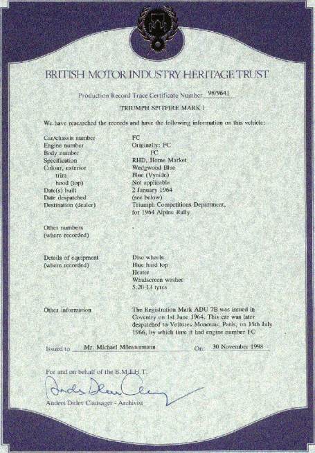 If you want to know in which specification your Triumph has once left the factory you can order a ‘birth certificate’ from the British Motor Heritage Trust in England and you will get such a nice letter. You want to know how to get it? Check here.